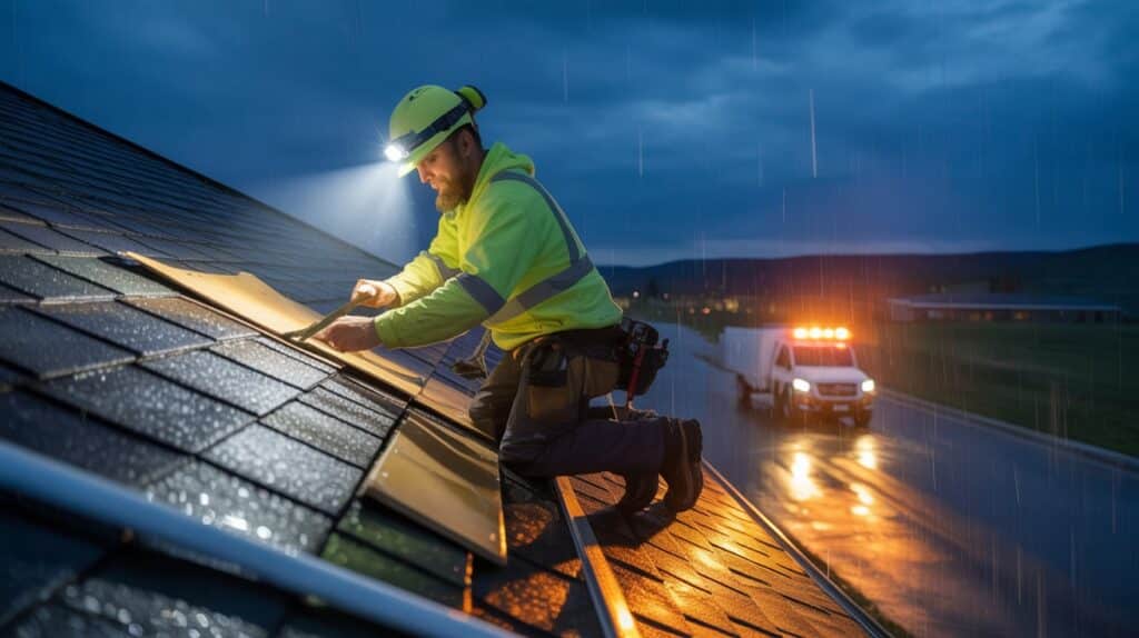Ensure everyone’s safety first. If water is entering your home, place containers to catch leaks. Then contact a professional emergency roofing contractor immediately for inspection and temporary protection.
